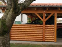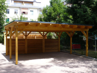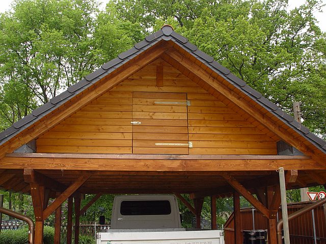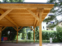 kg/m² ausgelegt. Die Qualität eines Carport zeigt sich vor allem in der hochwertigen Verarbeitung mit fast nicht sichtbaren Verbindungen. Die Schraubverbindungen werden mit Holzpfropfen ausgedübelt. Die Lebensdauer Ihres Carports entscheidet sich vor allem mit der Auswahl und Verarbeitung des Holzes. Wir empfehlen immer, das Holz mit einer Imprägnierlasur gegen Bläue und Insekten zu schützen.
